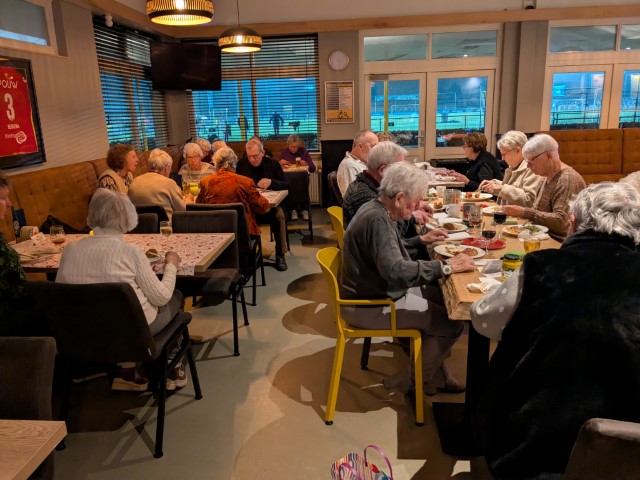 Het begon met een drankje en na de opening door Heintje, voorzitter, kon men naar de tafel met het uitgebreide buffet: zuurkool, hutspot, boerenkool, worst, gehaktballen, goulash en spareribs. Keuze genoeg dus en goed verzorgd door Slagerij Harmsen.