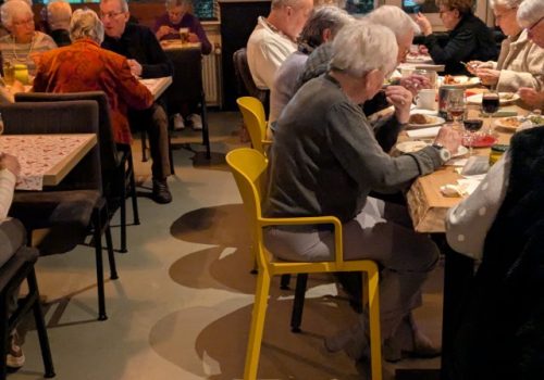 Tijdens het eten werd er gezellig gebabbeld aan de tafels.
